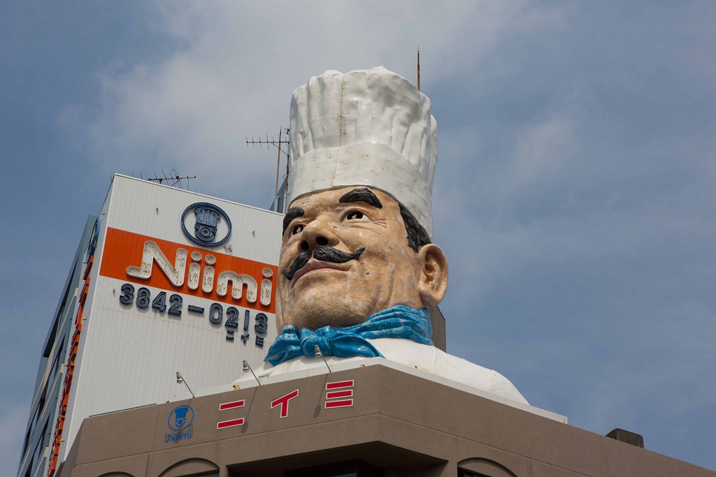 We decided to head there for a morning and see the sights. It is a bit hard to find (I was still getting familiar with using Google maps while walking) with one very prominent marker identifying the entrance to the street, but you have to look up. I took the photo and was left wondering – why is it an Italian looking chef instead of a Japanese head?