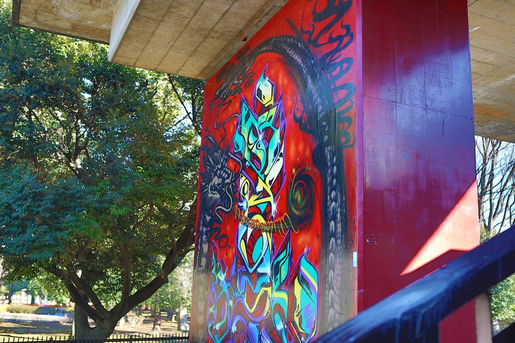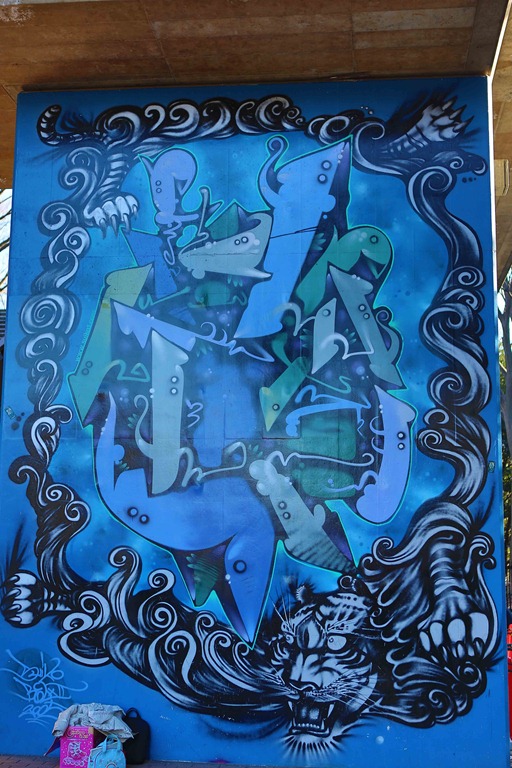 Some brilliantly colored graffiti under the bridge.