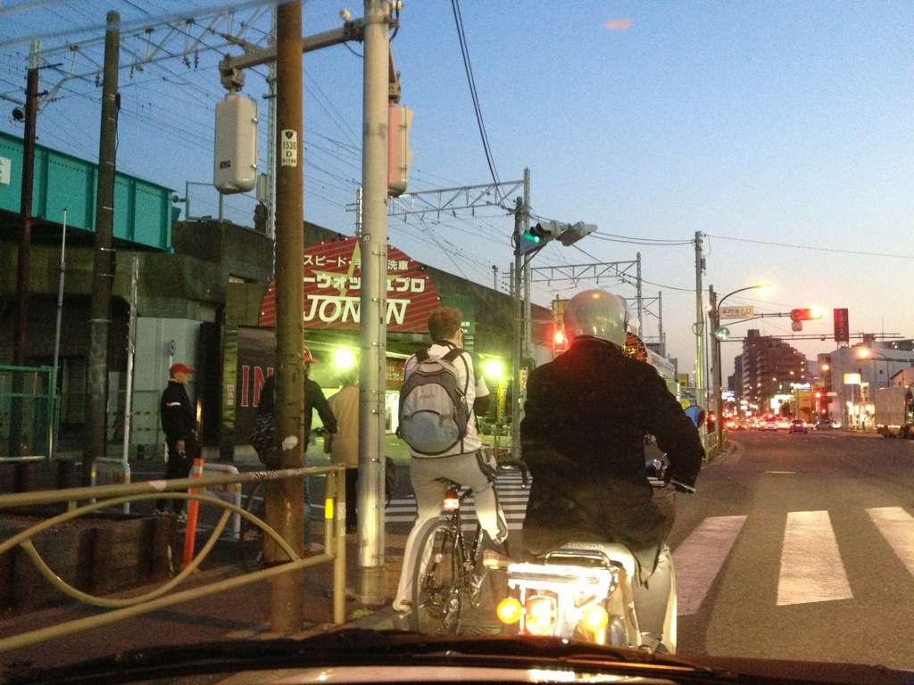 Last shot. No one in Japan wears bike helmets. The most amazing thing? Gaijin (like the guy in the middle) have adopted a “if you can’t beat them join ’em” attitude abandoning the helmet.