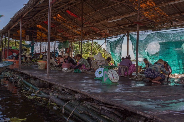 After lunch and the weaving we headed out on canoes to visit around the village. Our first stop was where they process the fish. It was amazing to see – they all worked in a cadence, the pounding of knives as they cut the fish.