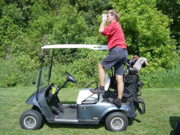 I came across this picture the other day – where I got got. I was in a golf tournament with a practical joker and he said ‘Can you tell me how far it is to that pin?”. The pin was over a hill so I had to climb on my cart to use my handy dandy laser scope. Little did I know that he was snapping a picture …..