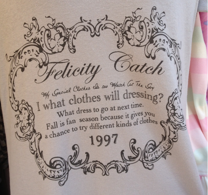 I have no idea why this one caught my eye in passing. I was walking from lunch and noticed the print on the front of this dress. Who/what is Felicity Catch and why grammar do time so bad?