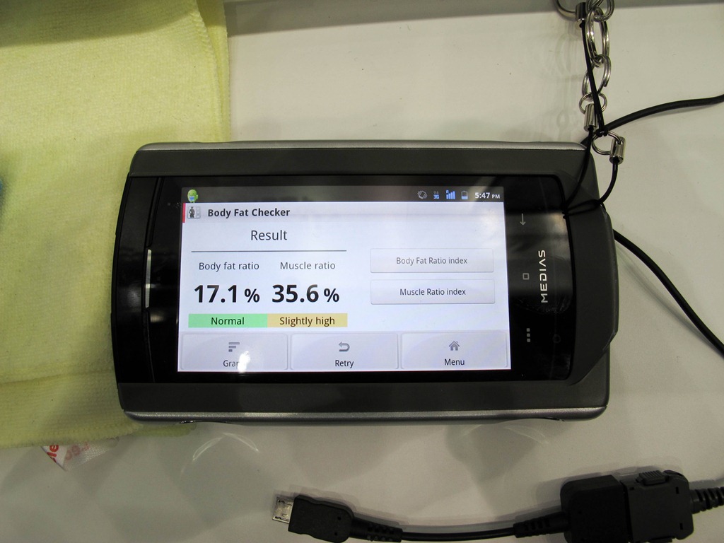 I had to try out the body fat sensor. You start by adding in parameters (Which was harder than it should of been as I still think of height and weight in Imperial – not metric) and then you put 4 fingers on these mental contact points on the sensor. Basically you hold it like a point and click camera. He explained that it sends a current through the body and by measuring resistance they make the calculation. My measurements are below … who knows if it is accurate.
