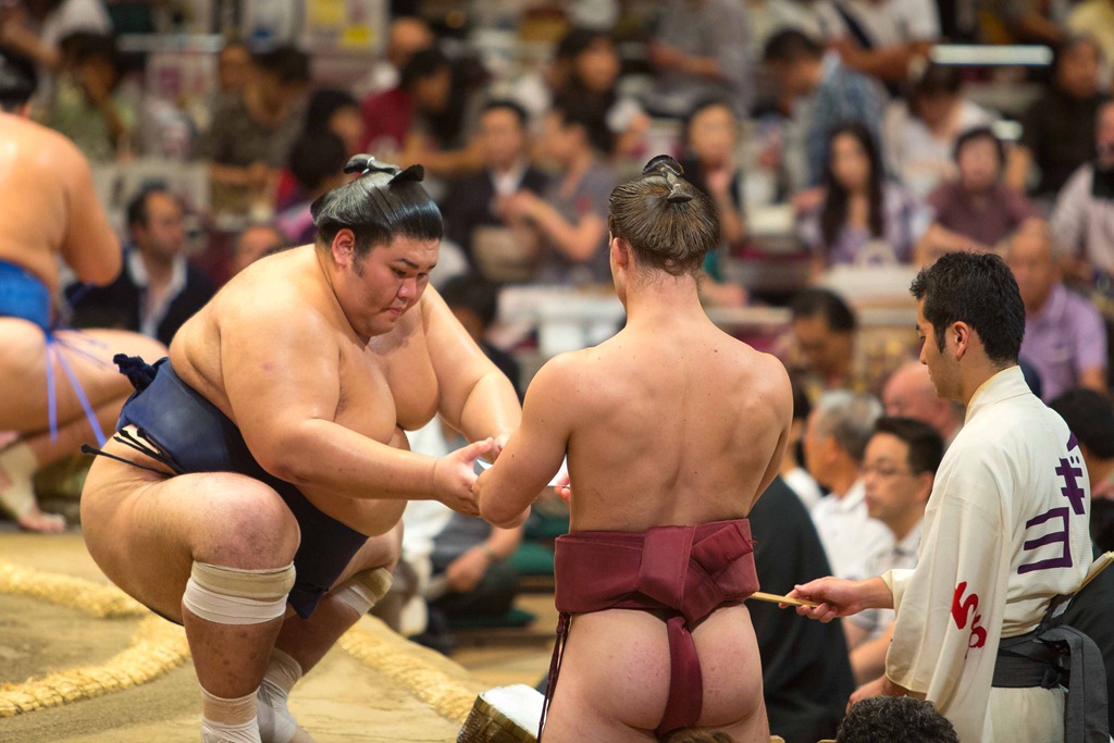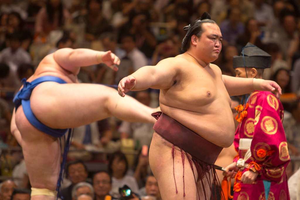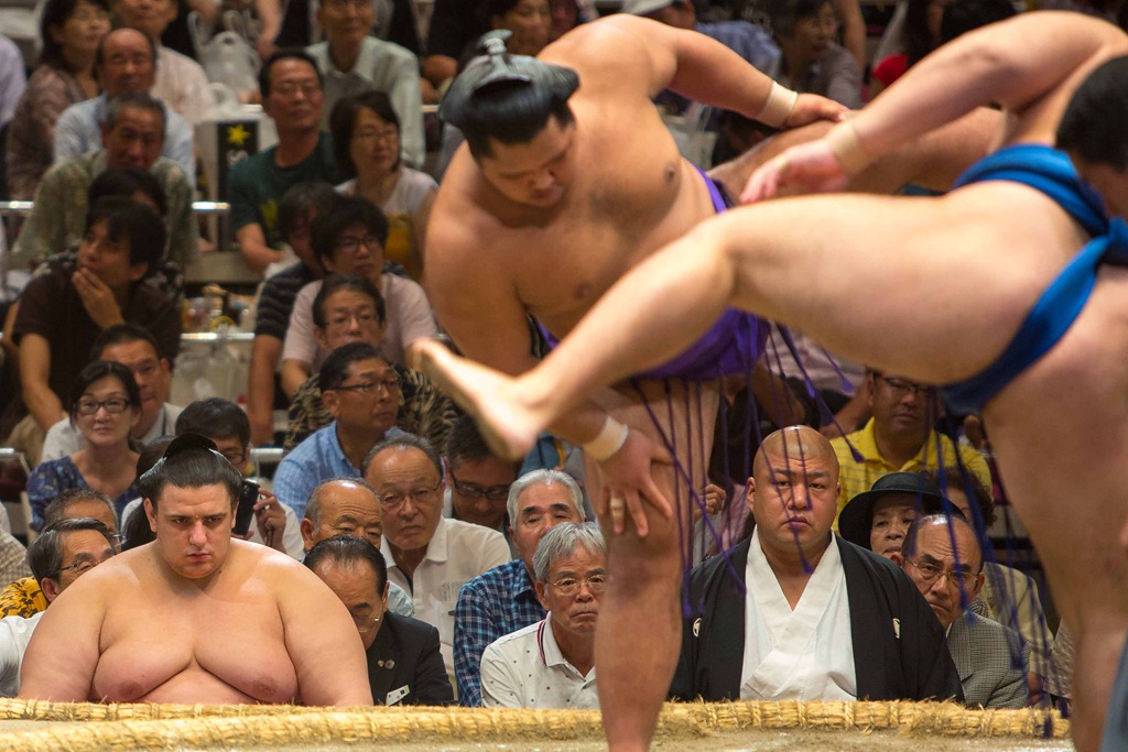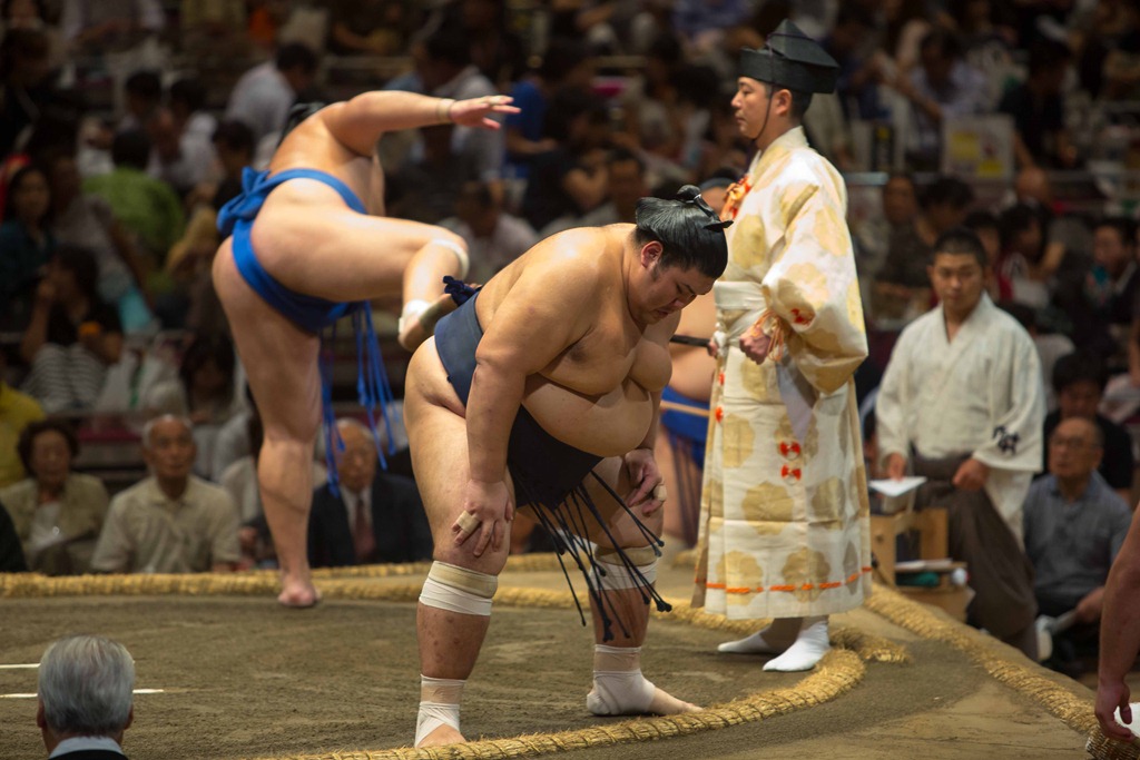 This salt is meant to purify the arena upon which the battle will take place, and to drive away any malicious spirits. The wrestlers now place themselves at the center of the dohyo, exactly behind the shikiri-sen, these “starting lines” drawn on the ground. Separated by only centimeters, the wrestlers stare again deep into each other’s eyes, and perform another shiko: clapping their hands, lifting up their right leg, and then their left.