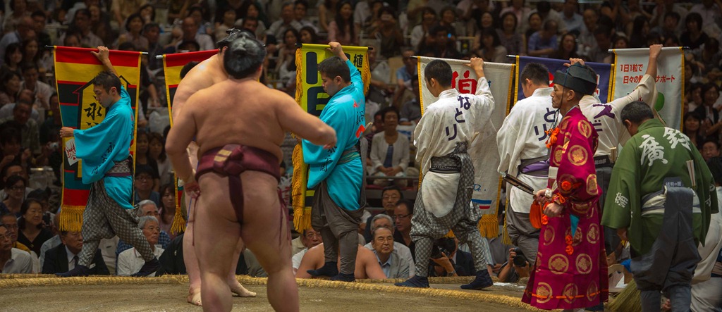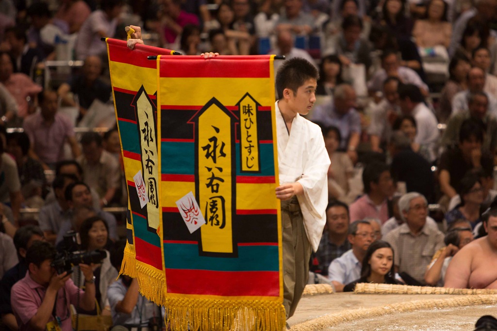 They then rise, and return once again to their own corner. It is at this moment that the kensho are presented. These banners symbolize the prize money, placed on the bout by the sponsors, that will be given to the winner of the bout. One banner represents each sum of money, and they are displayed and carried around the dohyo by the yobidashi.