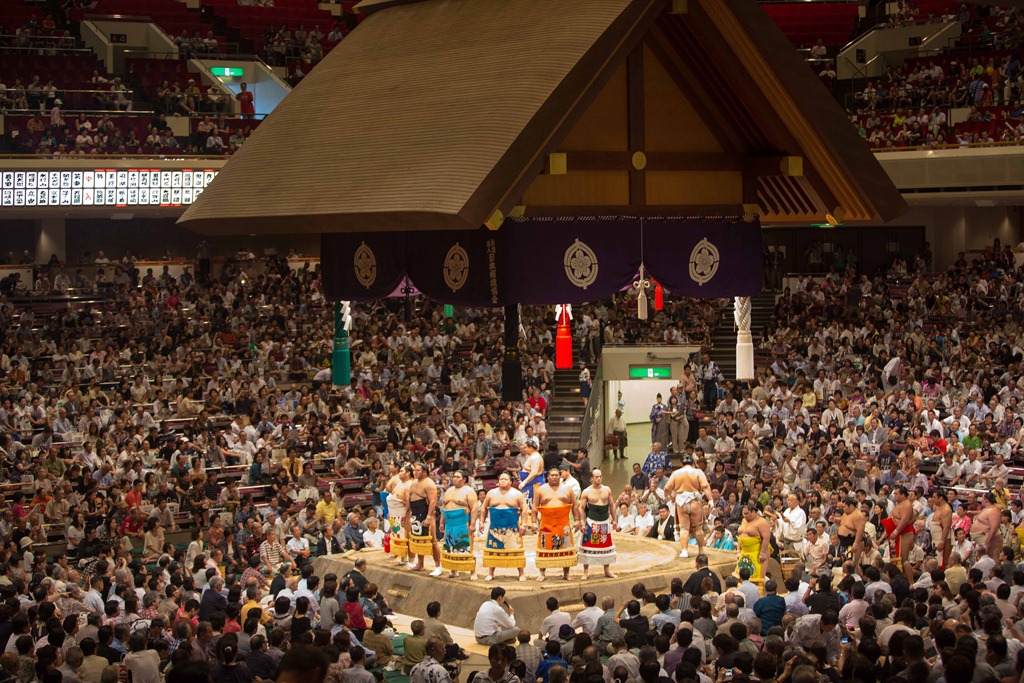 They rise, and step up onto the dohyo. While facing each other, they look straight into the eyes, lean, and then turn towards their “corner”, located respectively at south-east and south-west.