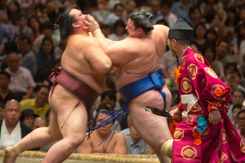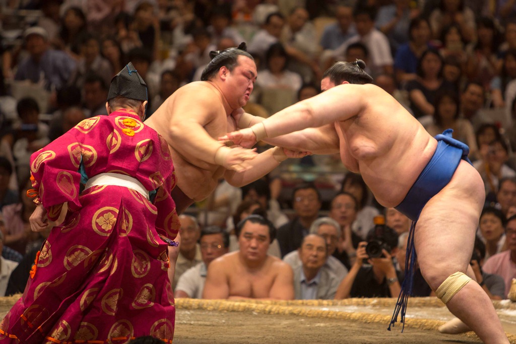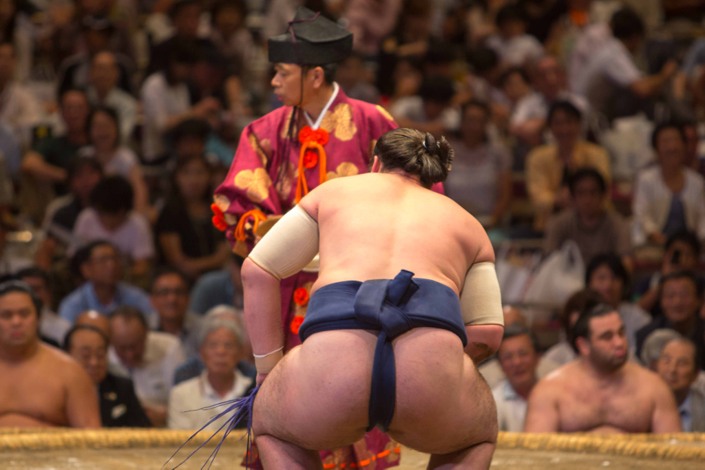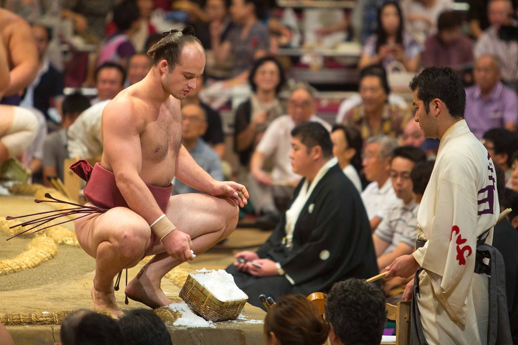 This salt is meant to purify the arena upon which the battle will take place, and to drive away any malicious spirits. The wrestlers now place themselves at the center of the dohyo, exactly behind the shikiri-sen, these “starting lines” drawn on the ground. Separated by only centimeters, the wrestlers stare again deep into each other’s eyes, and perform another shiko: clapping their hands, lifting up their right leg, and then their left.