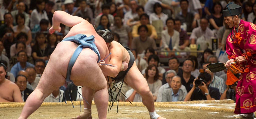 During this time, it is the gyoji’s (referee) turn to announce the names of the two wrestlers, in a very high-pitched and specially trained voice. Once their purification is done, the two rikishi direct themselves simultaneously to the side of the circle where they entered, straight east or straight west. Again, they squat down facing each other, knees wide (this position is called ‘sonkyo‘). They clap their hands powerfully once, and then raise their arms to a horizontal position, to show their opponent that they are not hiding any weapons and that they wish to meet in a fair fight.